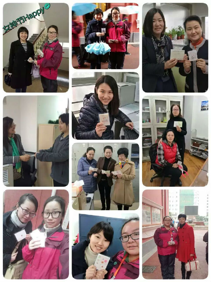 当天第二节课下课,工作站成员来到教师办公室,为在办公室中的各位女老师分发贺卡,照相留念。