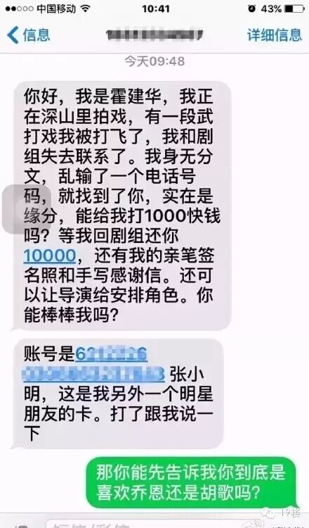 近日,有网友在微博上曝光了一则最新的诈骗信息。短信写道:“你好,我是霍建华,我正在深山里拍戏,有一段武打戏我被打飞了,我和剧组失去联系了。我身无分文,乱输了一个电话号码,就找到了你,实在是缘分,能给我打1000块钱吗?等我回剧组还你10000,还有我的亲笔签名照和手写感谢信。还可以让导演给安排角色。你能棒棒(帮帮)我吗?”该网友的回复也是超神:“那你能先告诉我你到底是喜欢乔恩还是胡歌吗?”