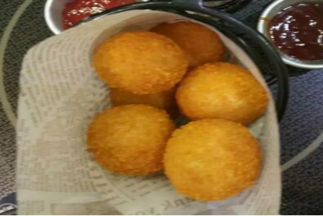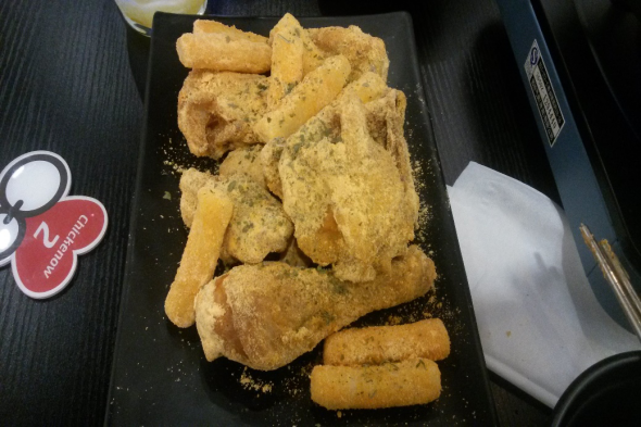 这是两人套餐里的炸鸡混有年糕,(推荐:芝士。上面裹着一层芝士粉,要上去满嘴芝士,脆脆的,点赞!)