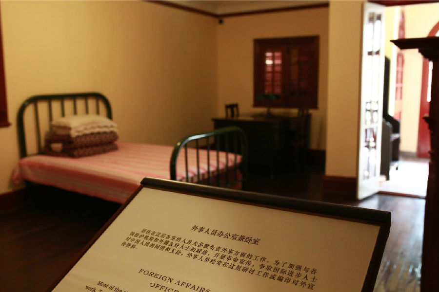 第一站是周公馆。活动当天天气相当不错,阳光洒落在树叶的缝隙间,使人的心情也感到愉悦,很多同学都提前到了目的地,在门口早早的跟导游老师相谈甚欢。人一到齐,导游老师就带着我们一行人进入了周公馆,周公馆内的陈设给人最大的印象就是简单,陈设罗列无一例外,一楼是会客室与周恩来的工作室兼卧室,中间则是餐厅。二楼整层楼面,是办事处外事人员的工作室兼卧室。陈列着收音机、英文打字机、油印机和编辑出版的《新华周刊》等物品。三楼正中一间是办事处集体宿舍。朝北的一间房间是董必武的工作室兼卧室。另外,底层还有传达室、汽车间。汽车间里停放着周恩来使用过的“别克”轿车(今为复制件)。