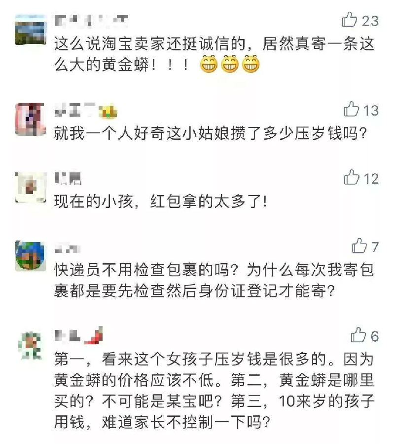 看到这里,小编着实惊呆了,压岁钱买蟒蛇这波操作我给这个女孩99分,少给一分是怕她骄傲!不过网上小伙伴看到这个新闻也是吐槽满满啊!