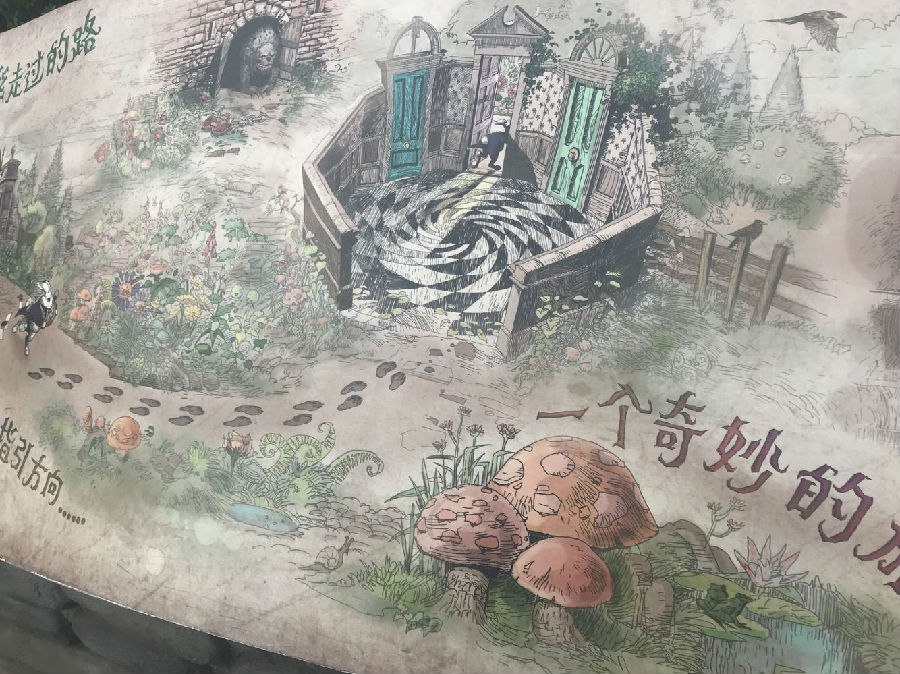 随后我们又转到了爱丽丝梦游仙境的迷宫,这是一个奇妙的地方,路上的指示牌指引着我们前进的方向,我们邂逅了蹲在草丛边上的妙妙猫、参观了红桃皇后的后花园、参加了疯帽子的茶会。