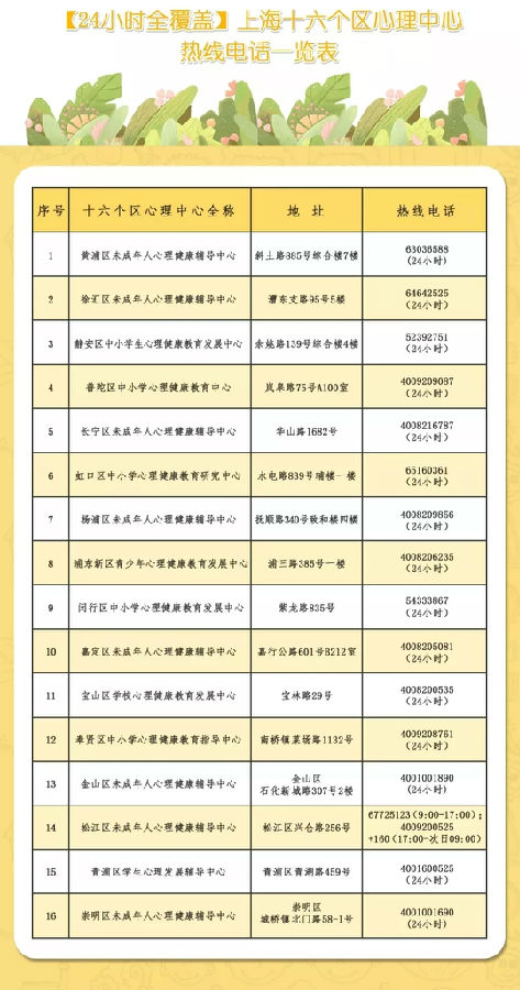 五、上海16个区心理热线,365天,24小时,心理支持服务,我们一直在坚守。