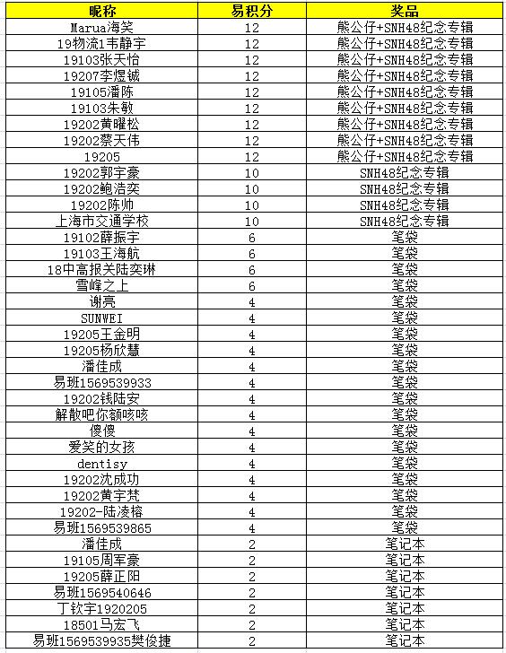 即日起至7月5日,在论坛中举办6个版块联合活动本次版块联合活动易积分排名前三的同学可获得熊公仔一份,前十可获得SNH48纪念专辑一份更有20份笔袋、卡套、笔记本随机附送礼品多多快来参与吧~!
