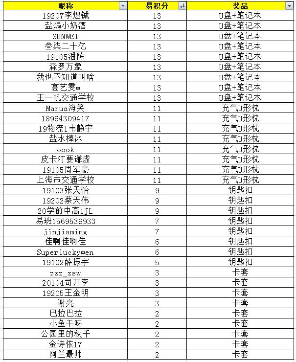 即日起至10月12日,在论坛中举办6个版块联合活动本次版块联合活动易积分排名前三的同学可获得U盘+笔记本一份,前十可获得充气U形枕一份更有20份钥匙扣、卡套、水笔随机附送礼品多多快来参与吧~!