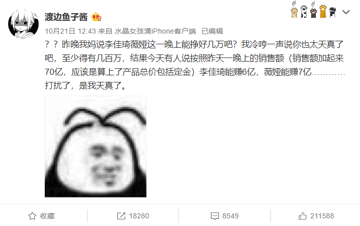 最近有网友粗略算了一笔账,薇娅一场双十一直播下来大概可以赚7个亿,李佳琦略微逊色,只能赚它个6亿……