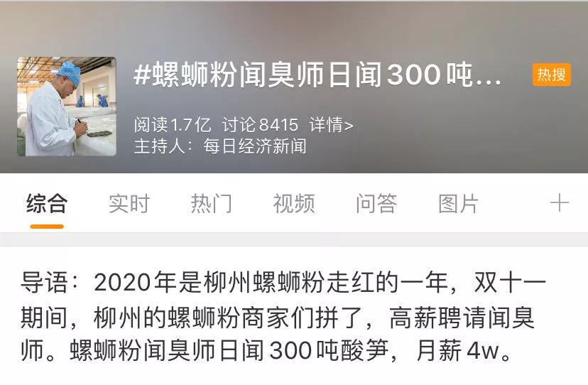 今年他被一工厂以50万年薪聘用为“闻臭师”,同时公司为他的鼻子投保50万,每天他的工作就是闻厂里,一共60缸、300吨的酸笋,光靠闻螺蛳粉酸笋的臭味,月薪就能高达4万。