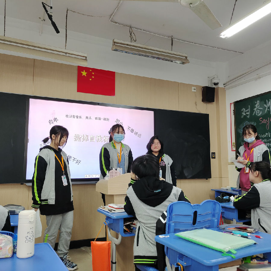 在本周四的班会课上,由我班的心理部长夏曹婧和宣传部长孙佳颖共同协作展开了一次主题班会活动,本次活动的主题是认识自我。