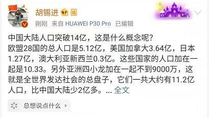 胡锡进:中国大陆人口突破14亿,这是什么概念呢?