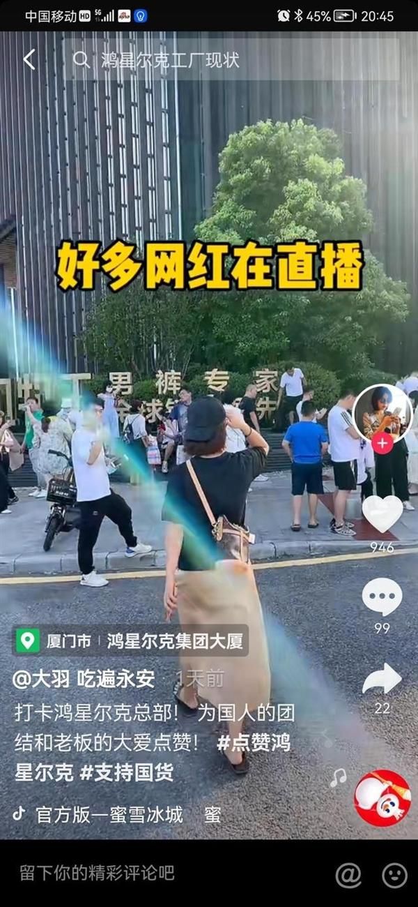 除了对鸿星尔克商品的支持以外,有报道称,近期还有许多人赶往位于厦门观音山商务区的鸿星尔克总部打卡,甚至还有不少平台主播在楼下架起了直播,现场有不少主播都在镜头前为鸿星尔克打气。