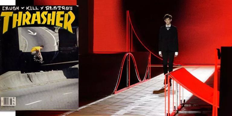 在16年的巴黎时装周,迪奥(Dior)搭建了的舞台是由霓虹灯照亮的滑板道具,一个是从街头摸爬滚打的反主流文化。一个是服务富人的高级时尚文化,两者相差甚远,却被设计师强行联系在一起,试图用这种反差创造出全新的风格。