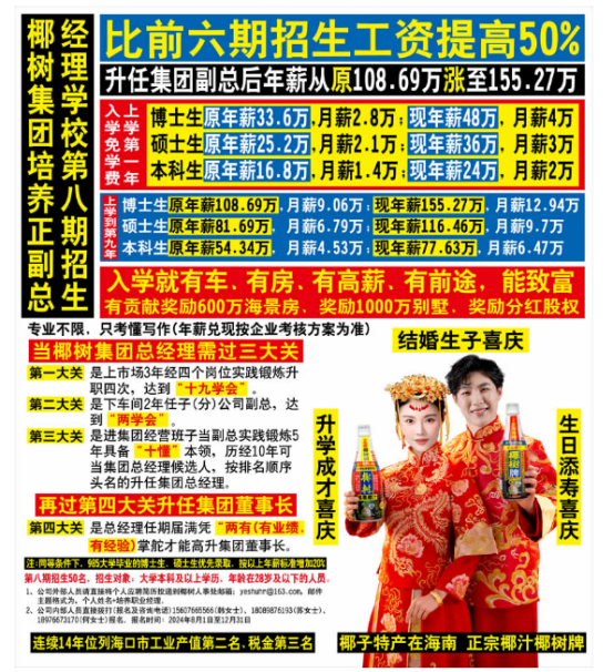 尽管提供的待遇颇丰,但招生海报上也注明年薪兑现按企业考核方案为准。另外,要当上椰树集团的总经理,仍需在市场、车间与集团经营班子历练十余年。