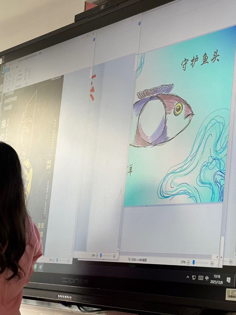 今天的图形课上,屏幕里这幅“守护鱼头”的画作让我印象深刻。课堂上我们围绕图形创作展开讨论,从线条的运用到色彩的搭配,再到主题的表达,每一个环节都充满趣味。