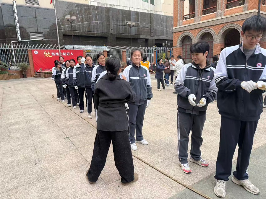 参赛队员们早早来到赛场,大家互相搓着冻红的手,又合力把粗麻绳捋直,找到最顺手的位置握紧。比赛还没开始,两队就已经摆好架势——脚蹬着脚、肩并着肩,身体使劲后倾,像一排排扎根大地的小松树,连眼神里都透着一股不服输的劲儿。围观的同学也围成一圈,有的举着自制的加油牌,有的攥着拳头,就等裁判的哨声。