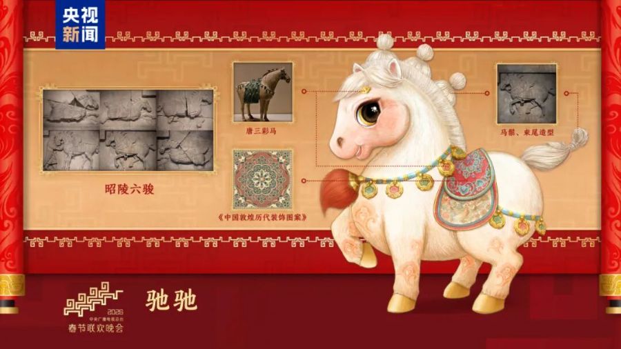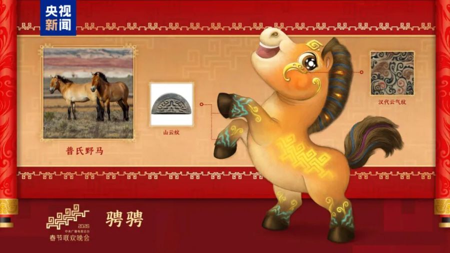 “骐骐”“骥骥”“驰驰”“骋骋”四匹骏马,活泼可爱、意气风发,与晚会主题“骐骥驰骋 势不可挡”一脉相承、相得益彰。吉祥物的设计灵感来源于中国不同时期马的经典形象,并将流云纹、山云纹等千年纹样“穿”上身充盈着生生不息的历史美感和万象更新的时代气象,饱含马到成功、前程似锦的美好寓意。