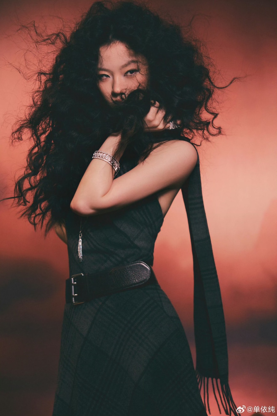 单依纯以一头蓬松的羊毛卷,在暖红渐变的背景中撞出极具张力的视觉冲击。浓密卷曲的发丝肆意飞扬,缠绕出慵懒又桀骜的氛围感,半遮的眉眼间藏着清冷疏离,指尖轻捻发丝的动作,又添了几分随性柔媚。