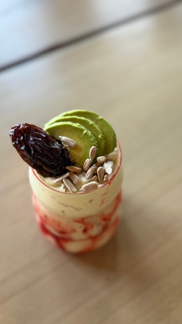 透明玻璃杯里,底层的草莓酱呈现出诱人的玛瑙红,丝丝缕缕地缠绕在杯壁,像是为这杯饮品画上了精致的边框。上层是奶白色的奶昔,融合了绵密的香蕉与醇厚的牛油果,质地顺滑得像融化的奶油,散发着浓郁却不腻人的果香。顶部的装饰更是用心,三片牛油果切得厚薄均匀,翠绿色的果肉透着新鲜的光泽,软糯的口感能瞬间抚平味蕾的焦躁;一颗蜜枣安静地倚靠在旁,深褐色的果肉紧实饱满,自带天然的甜香,为饮品增添了一抹醇厚的回甘。散落的瓜子仁则是点睛之笔,每一颗都饱满松脆,挖一勺送入口中,先是奶昔的丝滑冰凉,紧接着是牛油果的细腻、香蕉的香甜,再夹杂着瓜子仁的酥脆与蜜枣的蜜甜,草莓酱的酸甜在舌尖若隐若现,每一口都是丰富的层次碰撞。