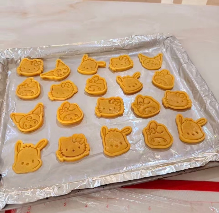 烤盘上铺着锡纸,整齐码放着多款造型可爱的卡通黄油饼干生坯,即将送入烤箱烘烤。这些饼干以三丽鸥经典IP为原型,包含Hello Kitty、库洛米、美乐蒂、帕恰狗等形象,用模具压出圆润轮廓与标志性五官,奶黄色的面团松软饱满,纹路清晰可爱,满满都是治愈感。背景是干净的白色餐桌,整体氛围温馨治愈,是充满童趣的手工烘焙场景,既适合亲子互动制作,也能作为可爱的伴手礼。