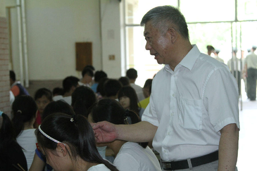 高国兴校长首先检阅了学生方队。同学们身着整齐的绿色迷彩服,在教官的带领下,用高亢有力的声音回应着高校长。“同学们好!”,“校长好!”,“同学们辛苦了!”,“为校争光!”。声音响遏行云,震彻长空。
