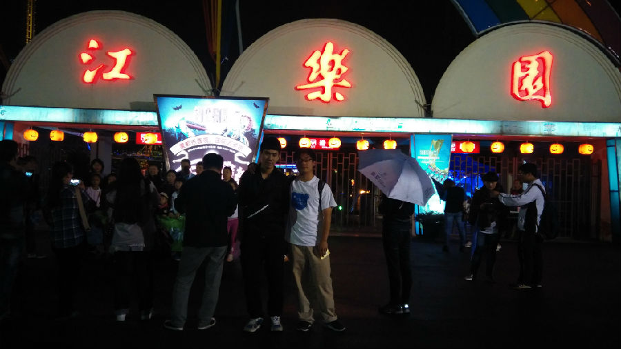 20141029日上海锦江乐园夜游。下午5.30时在绵绵细雨中我们到锦江乐园门口集合,等着胡老师给我们发票子。