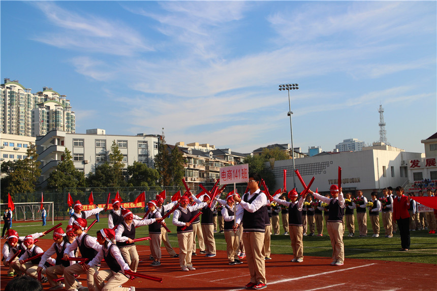 整齐的动作、新颖的造型使整个表演篇章显得光彩夺人,台下的老师同学们赞不绝口。由学生自选踏板操队融入了现代音乐的节拍,动作节奏有力让老师同学们眼前一亮,礼仪操队动作统一亮丽,展示出商校礼仪风貌。武术队的同学们动作灵活、快速有力。