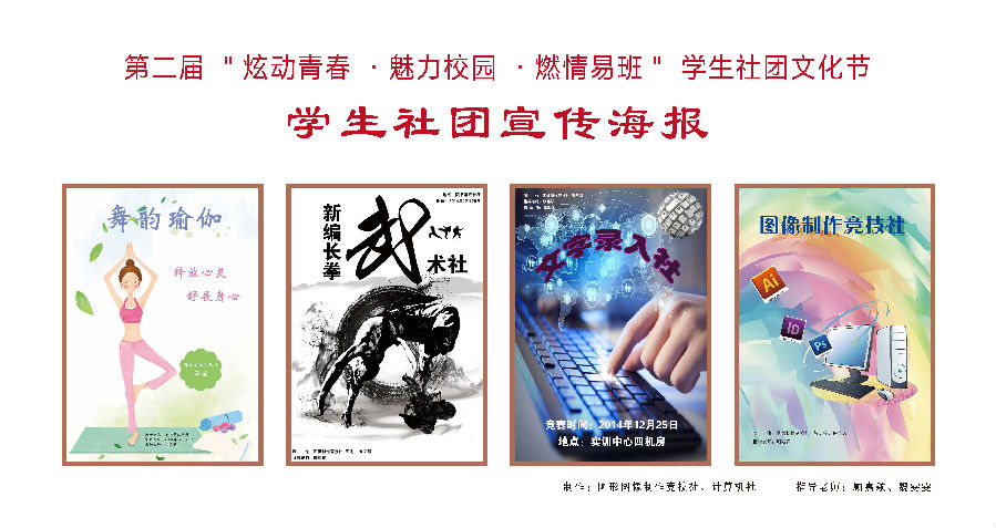 第二届“炫动青春 魅力校园 燃情易班”学生社团文化节正式拉开帷幕了~~。此次社团文化节,各社团老师和同学们都踊跃参加,图形图象竞技制作社和计算机社强强联手,为此次文化节每个社团都设计制作了漂亮的宣传海报,接下来请大家一起欣赏他们设计的海报~~我们将在文化节后开设投票活动,到时请为你喜爱的海报投上一票噢~~