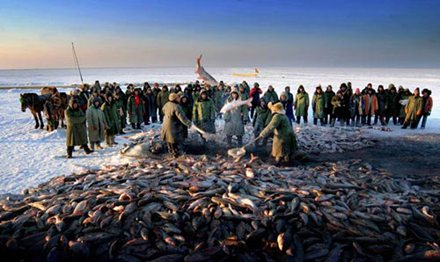 人们会在冰面上凿一个长约2米,宽约1米的下网口,并且在这里下网,然后会用杆子在冰下以大约120度的夹角向左右两边引导、铺展渔网,在这个过程中,人们已经在冰面上特定的位置打出了冰孔,只要渔网按照设计好的路线铺展,就会依次到达这些冰孔,驻守在那里的人再用特制的钩子校正冰下杆子的位置,继续以一定角度使渔网弯折到达下一个冰孔,总共要打几十上百个冰眼,直到铺展的渔网两端再次汇合在出网口……如果把这事说得再简单点,那就是要在冰面下的湖水中用渔网围一个大圈,把鱼圈起来,然后收网,再把鱼弄出来。当牲口通过绞盘,拉着渔网裹挟着10多万公斤的活鱼从1米宽2米长的出网口出来的时候,那场面想想也是相当震撼的。