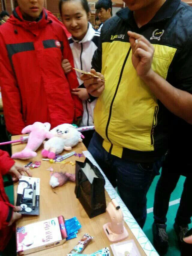 过了好长时间,有一位新疆部的同学来光临,我们也同样使出浑身解数,尽最大能力来推销,只见他挑出自己喜欢的,然后问出价格,我们说了多少钱之后,他付了帐就走了。可见,他足够爽快又足够有爱心呀。噢耶,真的好快啊,我们的义卖品只有最后的几样了,见到这样的场景,我们就有更多的动力了,完成之后就可以收场了。快快快,我们在心里不约而同的在催促。