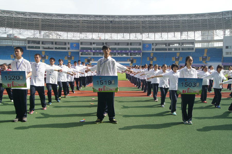 2015年10月23日上午9:30分,我校在上海浦东源深体育中心开展了校园运动会。本次广播操比赛是由徐崔华老师为总裁判长,孙海明,黄丽萍,李晨海,龚武斌,尹淑风老师为广播操裁判。这次广播操比赛由我校15届的10个新生班级来参加比赛。