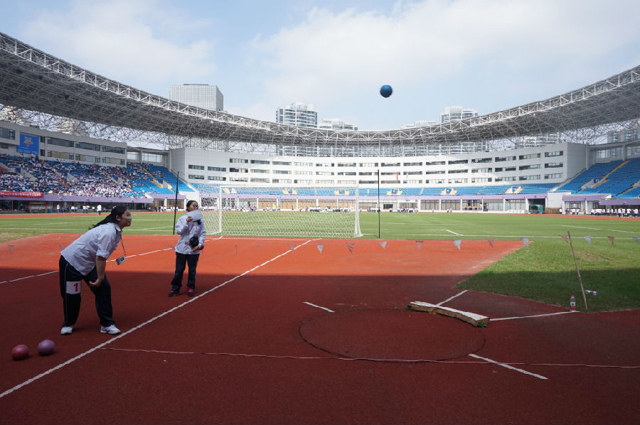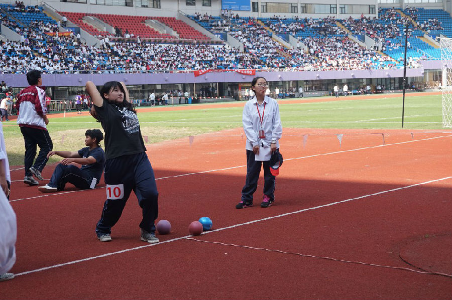 上午10点20分,女子实心球决赛开始了,选手们的上场实力一个比一个优秀,但是他们不惧怕对手反倒是更加有竞争意识,用力抛出的弧线像是胜利的旗帜在挥舞,引得校长也愉快地参与进来。11点,男子实心球决赛开始,男选手们的实力更是惊人,每次抛出的实心球都像是掷出了一枚导弹飞得又快又远,赢得围观同学的连连叫好。指导员老师低头认真地在本子上记着每位选手的分数;捡球的同学也在一旁不辞辛劳的一遍遍捡着,重复着弯腰的动作;在观众席上的同学们站起来,为每位运动健儿们呐喊助威,加油声响彻了整个体育馆。